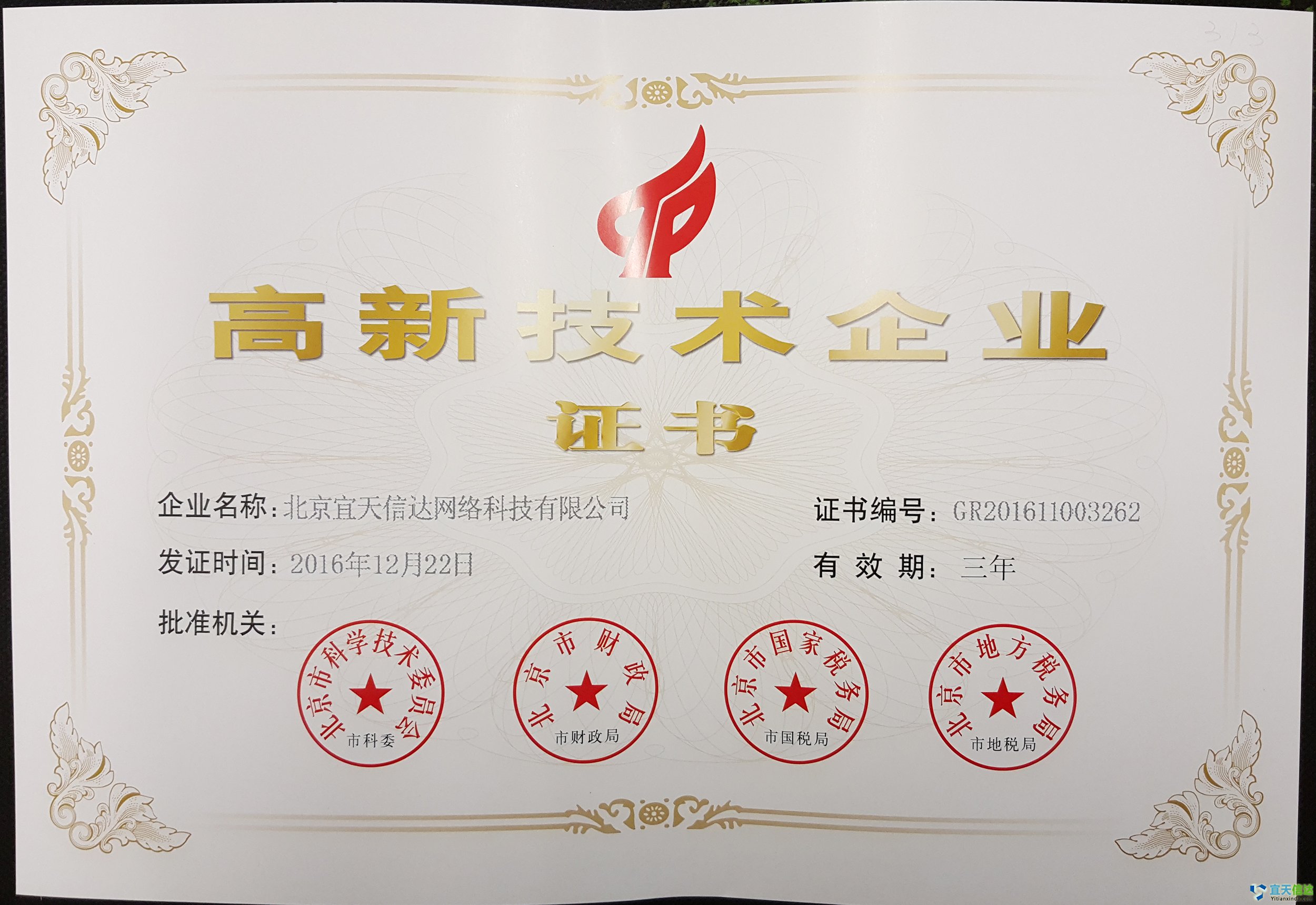 北京宜天信達(dá)網(wǎng)絡(luò)科技有限公司榮獲由北京市科技創(chuàng)新委員會(huì)、北京市財(cái)政委員會(huì)批準(zhǔn)頒發(fā)的“高新技術(shù)企業(yè)認(rèn)定”。